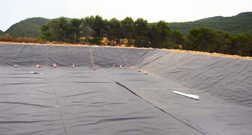 Imperméabilisation d'un bassin, d'eau non potable, avec géomembrane homogène de polychlorure de vinyle plastifié (PVC-P), avec résistance aux intempéries, de 1,2 mm d'épaisseur, couleur gris, placée sans adhérer au support sur géotextile non tissé composé de fibres de polypropylène unies par aiguilletage, avec une résistance à la traction longitudinale de 21,1 kN/m et une résistance à la traction transversale de 24,8 kN/m. |