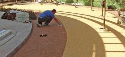 Revêtement continu drainant pour usage piéton, de 40 mm d'épaisseur, réalisé "in situ" avec du mortier à base de résines et de granulats de couleurs sélectionnées avec granulométrie de 4/7 mm, placé sur une couche de 30 mm de matériau granulaire. |