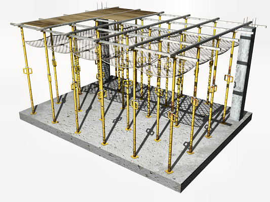 Système de coffrage continu pour plancher-dalle massif en béton armé, jusqu'à 3 m de hauteur d'étage libre, composé de: étais, poutrelles métalliques et surface coffrante en bois traitée renforcée avec tiges et profilés. |