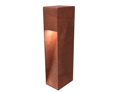 Balise de 1100 mm de hauteur, composée de corps en acier corten de 6 mm d'épaisseur et d'un réflecteur incliné en acier inoxydable AISI 304, avec 3 DEL de 25 W, classe de protection I, degré de protection IP66, y compris les boulons d'ancrage.