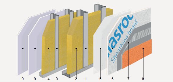 ELB050 Couche principale d'une façade ventilée à ossature autoportante, avec contrecloison. Système Placotherm Integra Glasroc X "PLACO"