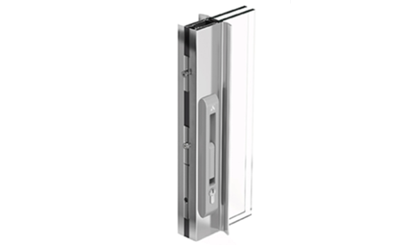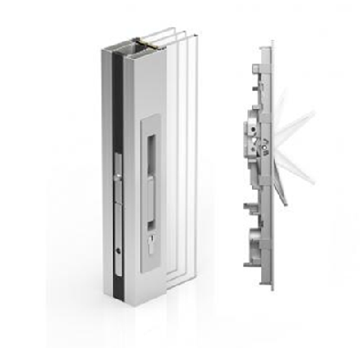 Système de blocage avec fermeture intérieure et intérieure, pour porte coulissante avec vantaux de grandes dimensions.