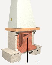 Cheminée traditionnelle "in situ", composée d'un foyer ouvert de briques réfractaires en terre cuite, pose avec du mortier réfractaire, type G, selon NF EN 998-2 et d'une hotte de briques creuses en terre cuite revêtue de plâtre. | ||